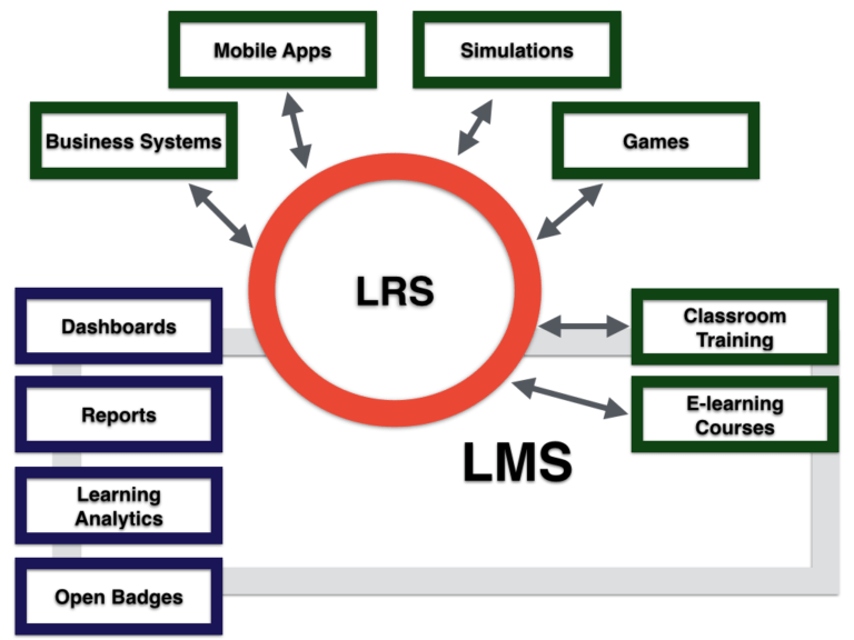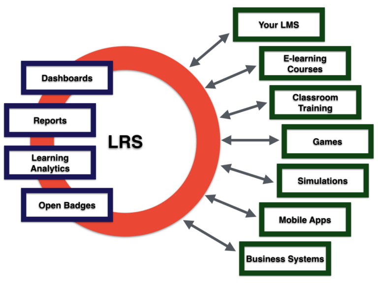 - Learning Record Store (LRS): When a learning activity needs to be recorded, such as completing a module in an e-learning course or attending a workshop, the application or system involved sends a secure statement to a Learning Record Store (LRS). The LRS acts as a repository for all the learning statements made. For example:
