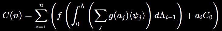 • Explanation: This integral model represents consciousness C as an ongoing accumulation of quantum states, limited by a processing threshold Λ. Each state ψi, weighted by coherence function g(ai), contributes to the consciousness experience. This accumulation implies a dynamic consciousness that constantly integrates new information, shaped by processing constraints yet adaptable.