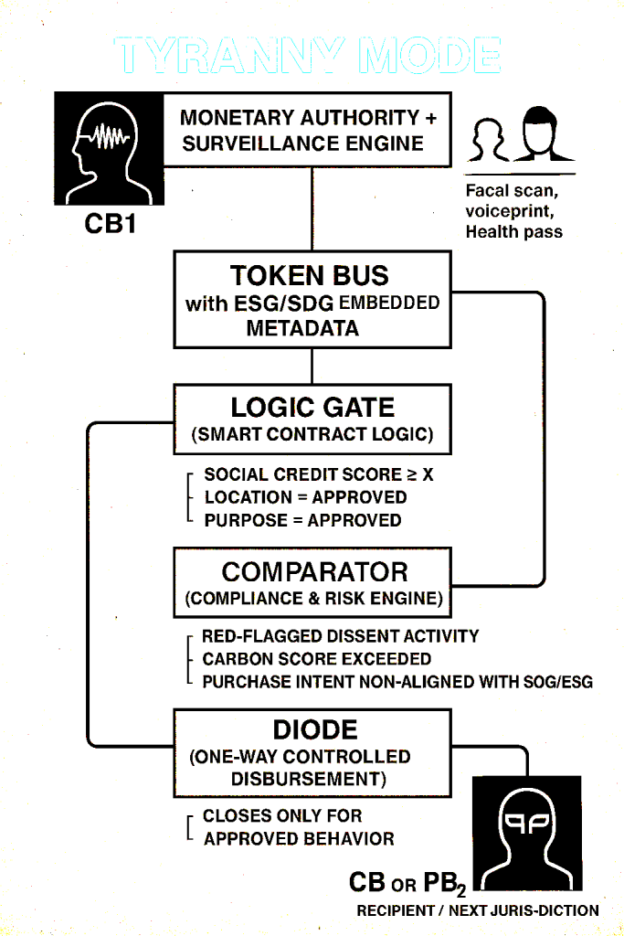 Behind the sleek language of efficiency, inclusion, and innovation lies a programmable apparatus of total behavioral enforcement. With every transaction mapped, every identity verified, and every coin coded with rules, we risk constructing an invisible panopticon, one where your access to money, movement, and participation in society hinges on your compliance with shifting political, environmental, and ideological mandates.