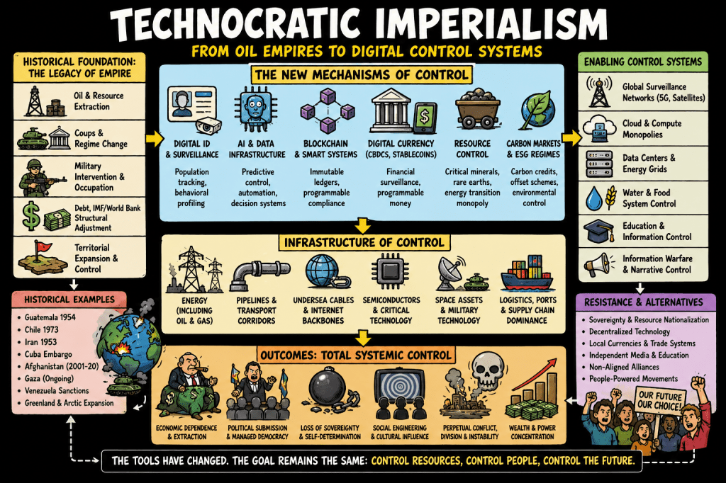 The old empire used military power, intelligence agencies, debt, sanctions, coups, and corporate law to secure bananas, copper, oil, land, ports, and minerals. The new empire uses the same basic tools to secure compute, chips, critical minerals, digital rails, energy corridors, payment systems, water, and carbon markets.